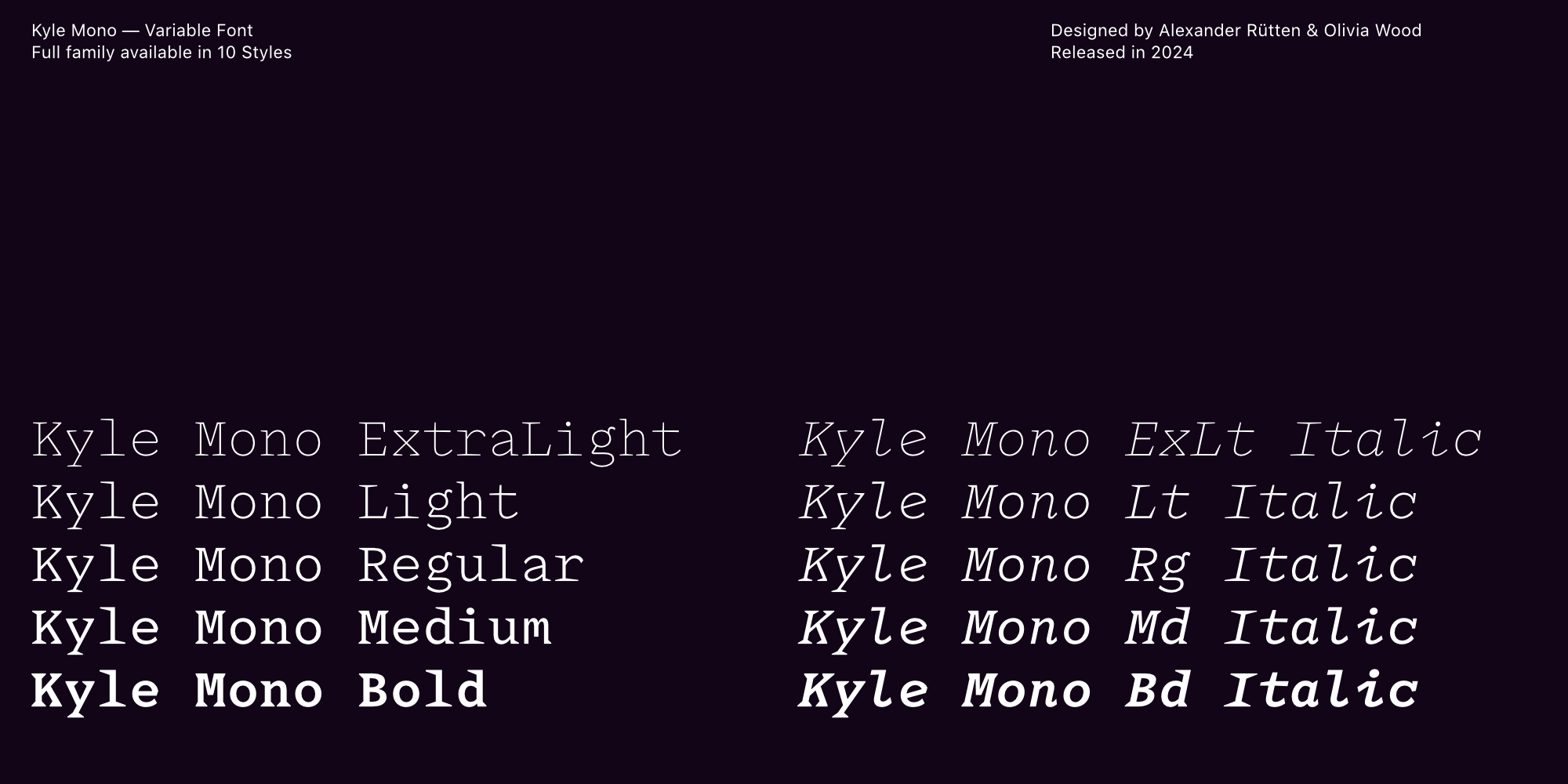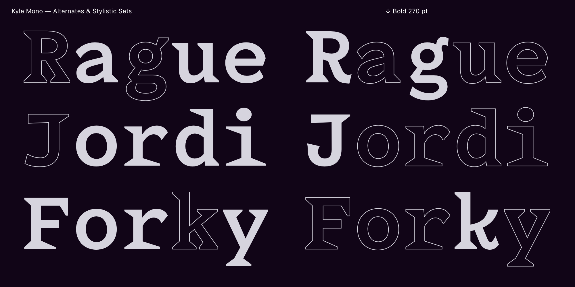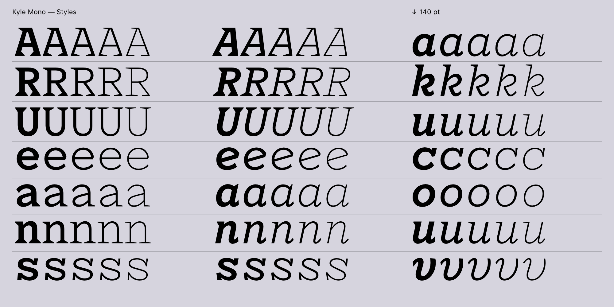 Kyle Mono is a non proportional, mono-line serif font family. It is a sibling to the font family Kyle, that changes its character with increasing weight. Kyles and Kyle Monos glyphs have sharp, triangular serifs that gain momentum as the weight grows, becoming almost slab-like.