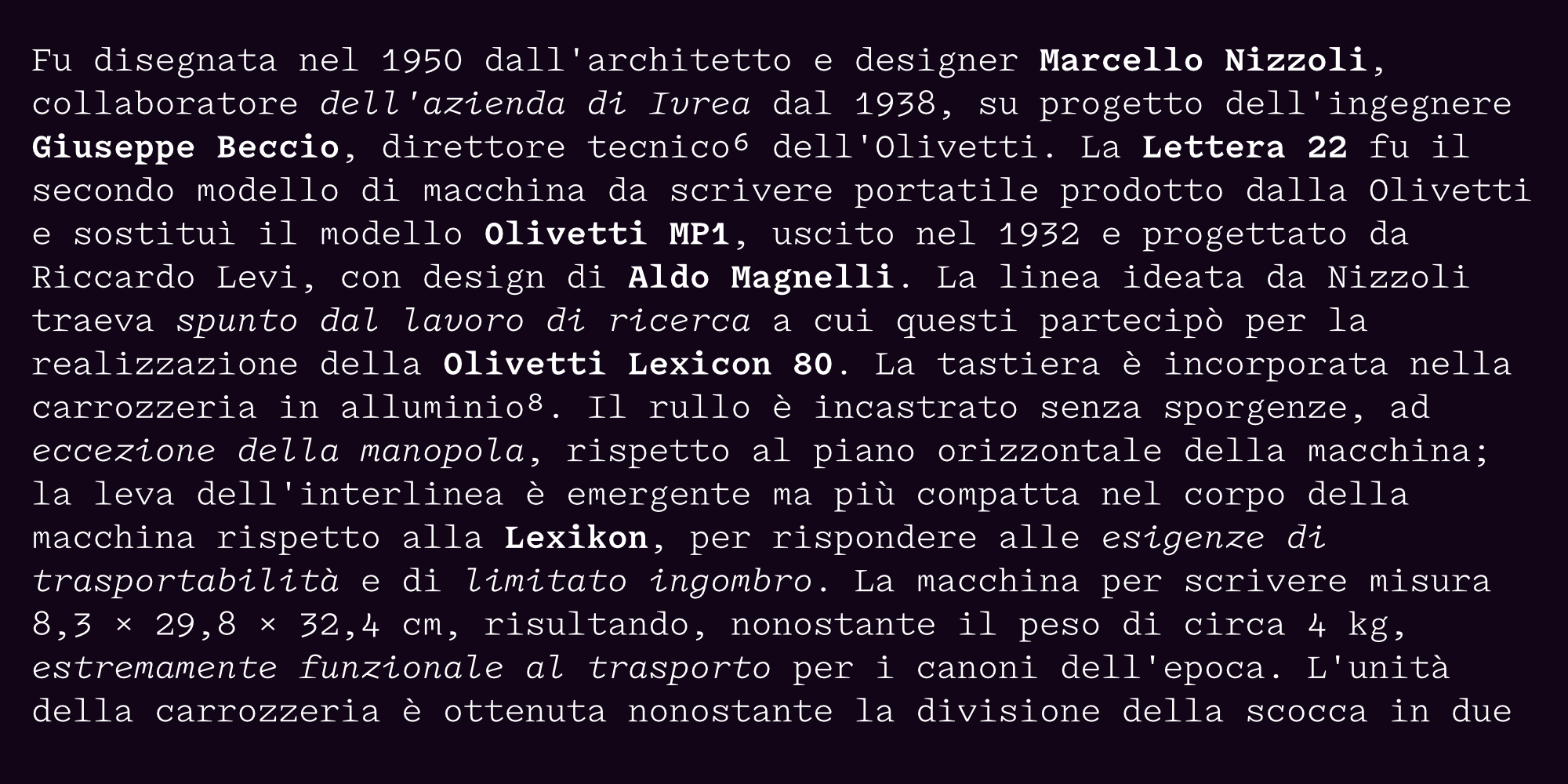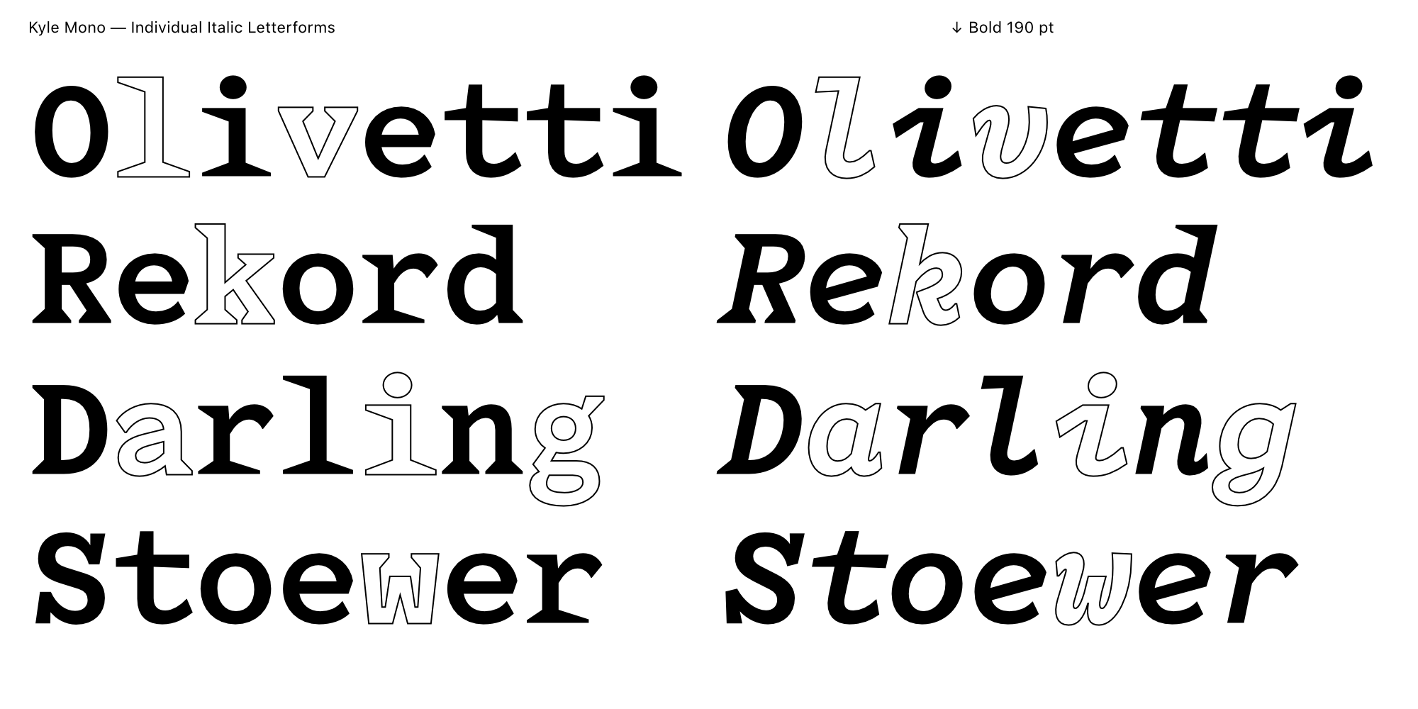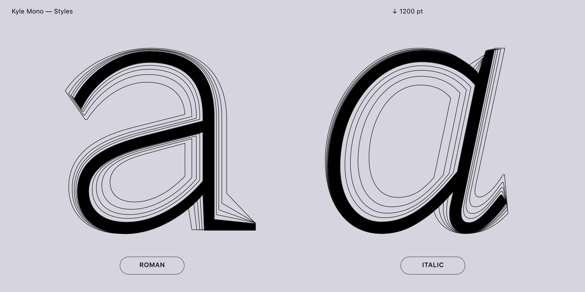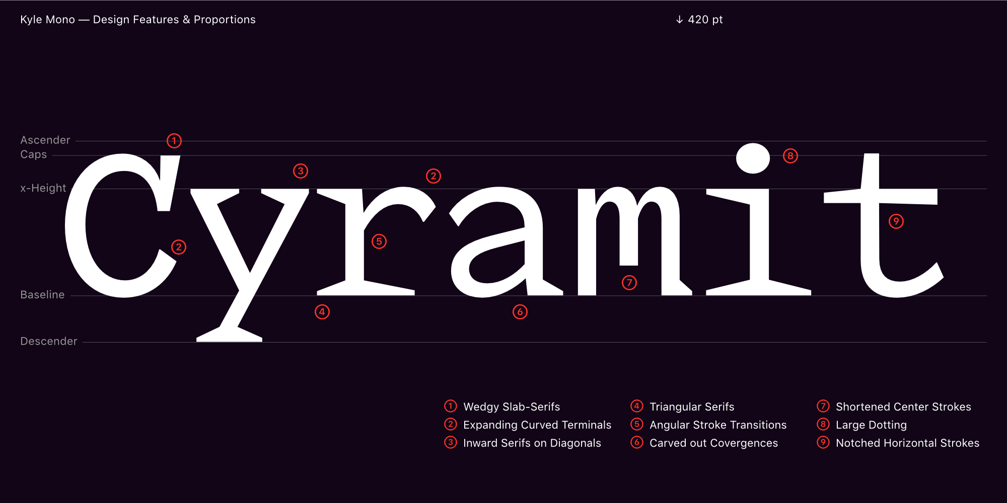 Kyle Mono is a non proportional, mono-line serif font family. It is a sibling to the font family Kyle, that changes its character with increasing weight. Kyles and Kyle Monos glyphs have sharp, triangular serifs that gain momentum as the weight grows, becoming almost slab-like.