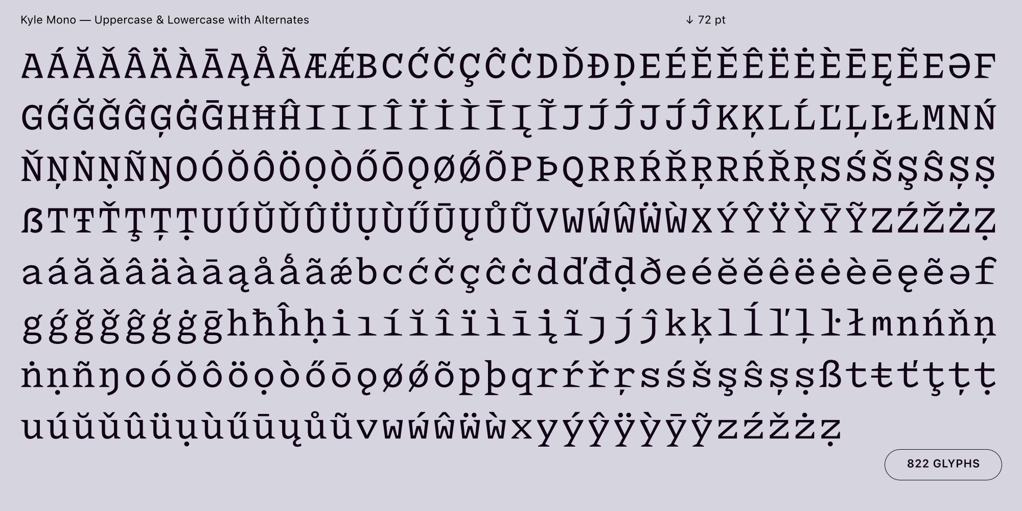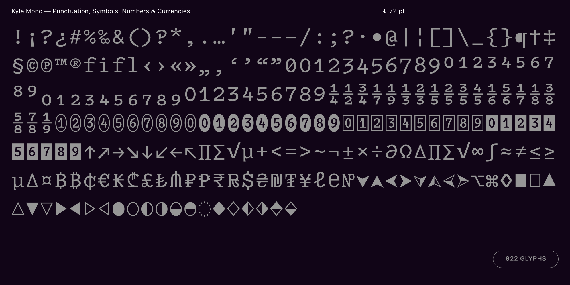 Kyle Mono has a slightly less extensive character set than Kyle, but still it counts over 820 glyphs and supports Eastern European languages as well as Central- and Western European languages. It also contains a number of practical symbols, often adjusted to add interest by playing with the monospace rule.